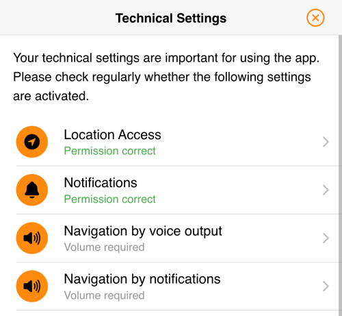 The easiest way to verify that your app permissions are correct is to click on **Technical Support** in the app and there on the button **Check technical settings**. It should look like this:
